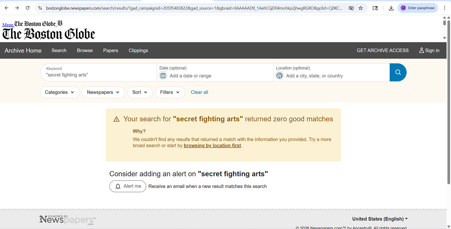 For next time, I’d like to dive a bit deeper into Secret Fighting Arts and the two subsequent books Smith published under the Gilbey pseudonym. I think it’ll be useful to consider what made them so effective as parody, and what Smith’s recollections might tell us about how to assess certain elements in the work of his good friend and co-prankster, Donn Draeger.