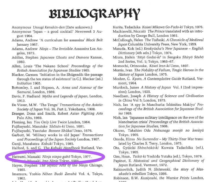 Obviously, as I’ve noted previously, the use of a children’s book as a major source reveals some very unflattering things about Turnbull and Draeger’s approach to writing history. But I’m moved to say that Hatsumi himself doesn’t come off that well either. It’s one thing to write a children’s book for entertainment purposes - you do you, bro. But the fact is that Draeger and Turnbull both came to Hatsumi with an apparent good-faith interest in the ‘ninja,’ and he gave them a children’s book filled with fanciful bullshit. That suggests a certain fundamental lack of seriousness on Hatsumi’s part, and I’m also not sure what it says about how seriously he took the two authors as researchers.