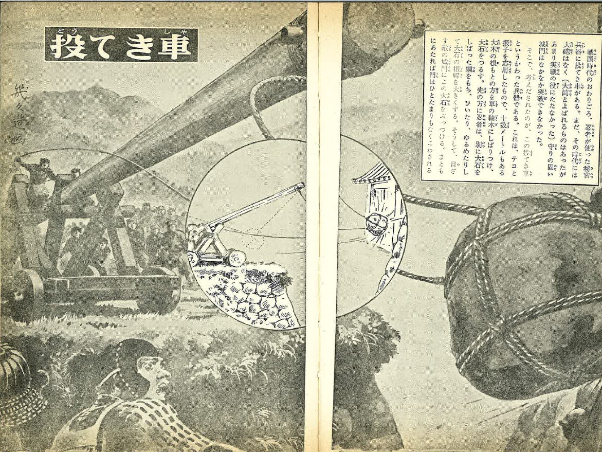 There’s also the “Stone-Thrower Wagon” (tōtekisha), a bloody great wrecking ball for smashing in the gate of a castle. I had been under the impression that ‘ninja’ were specialists in stealth, but perhaps I misunderstood: