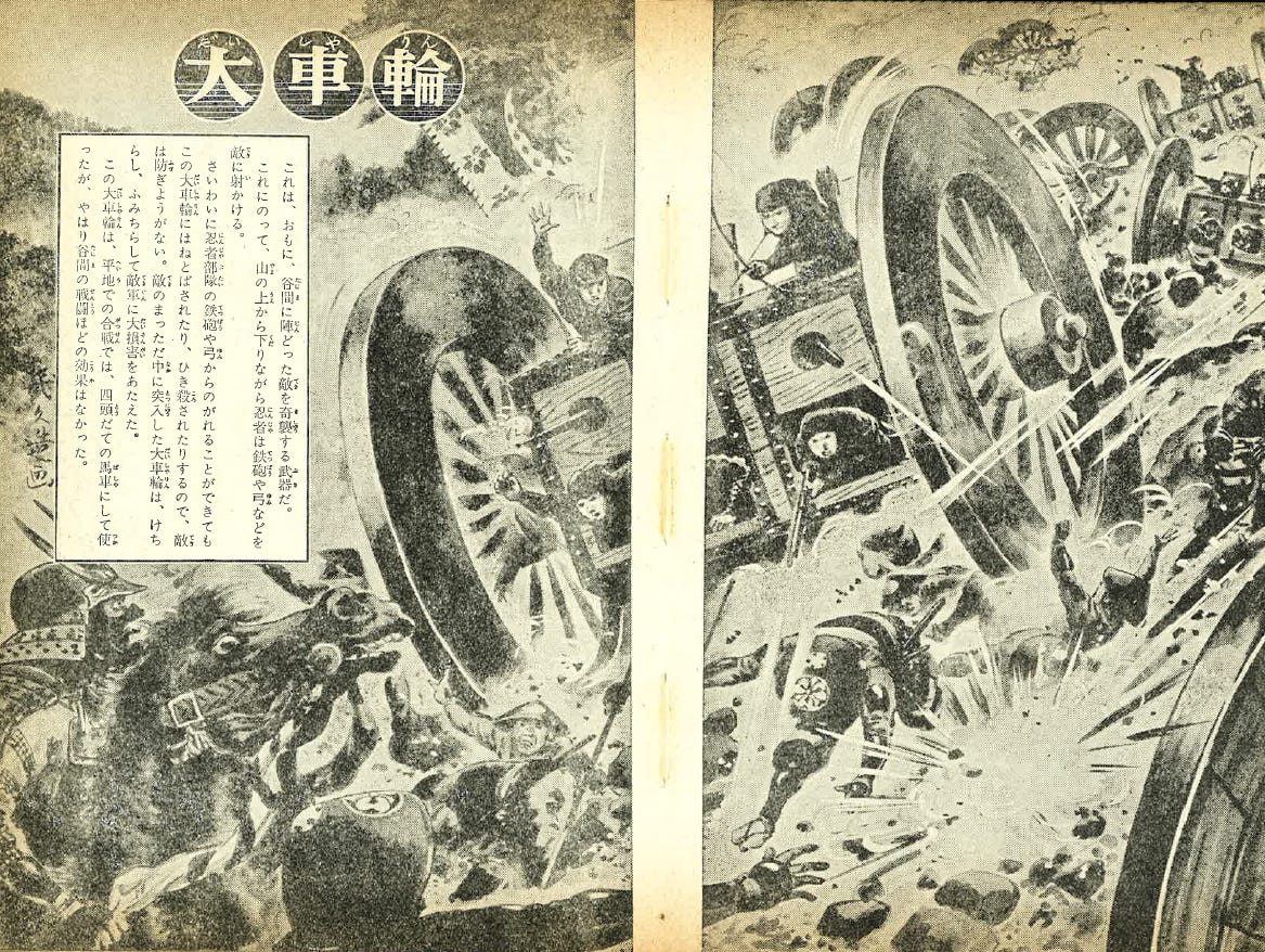 An enemy position located in a deep and large valley could be invaded with terrifying speed and effect by means of the daisharin (big wheel). The daisharin was a cart that rolled on huge wooden wheels. Between the wheels rested a small cupola fitted with portholes through which the ninja could fire cannons and small arms, or toss bombs…even if the warriors avoided the fusillade of fire, the heavy masses of the carts themselves were sure to crush substantial numbers of men, horses, and equipment.5
