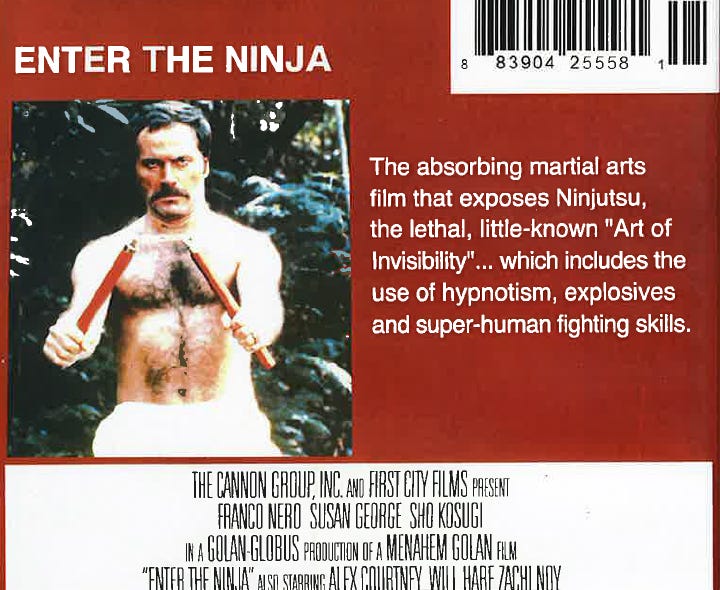 I don’t think the copywriter here had actually seen the film, because as far as I can recall there’s no hypnotism in Enter the Ninja, but whatever.